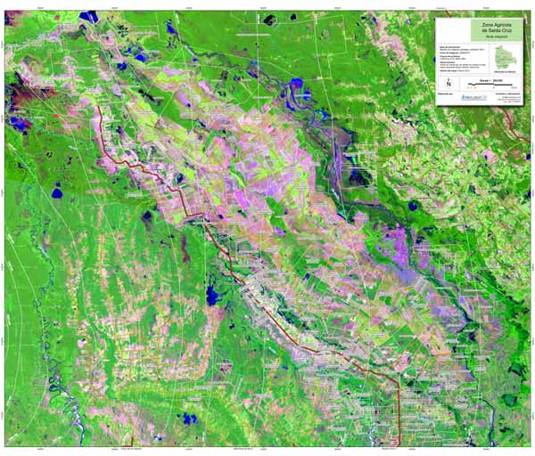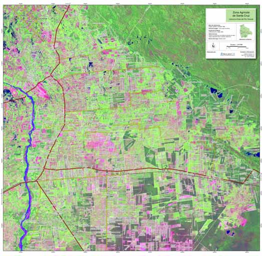 Los mapas de las zonas productivas de Santa Cruz se elaboraron con imágenes satelitales LANDSAT de fondo, con geometría y datos de predios actualizados, caminos principales y secundarios, distancias e isoyetas.